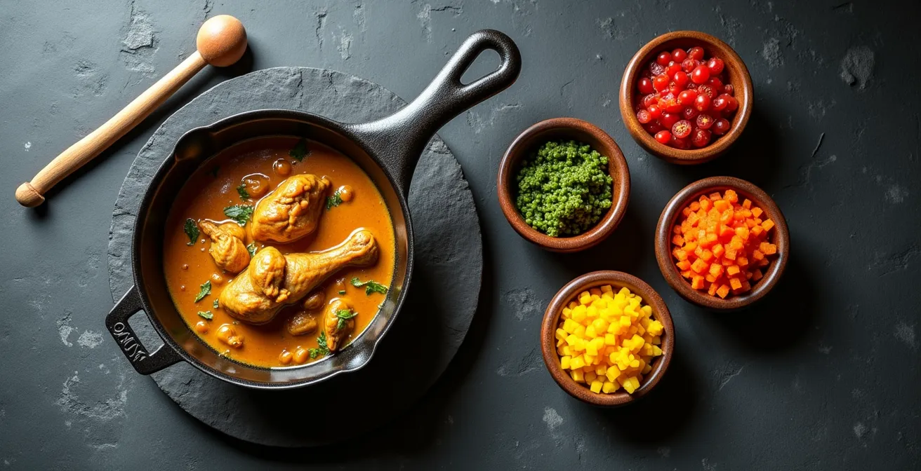 La séquence est immuable. On commence par faire dorer les morceaux de poulet dans un fond d’huile chaude pour bien les saisir. Une fois colorés, on les retire et on les réserve. C’est dans cette même marmite, maintenant imprégnée des sucs de la viande, que la magie du roussi va opérer. On y fait revenir les oignons émincés à feu très doux. Le secret est la cuisson lente, qui permet aux sucres naturels de l’oignon de caraméliser sans brûler. Il faut patiemment gratter le fond de la marmite avec une cuillère en bois pour décoller les sucs de cuisson et les mélanger aux oignons. La couleur recherchée est un roux ambré, jamais noir, qui serait synonyme d’amertume.